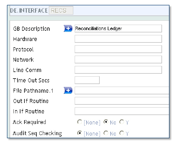 DE.INTERFACE contains details of the protocols for all interfaces, which use the generic delivery interface. The ID of the file is the interface as defined in the Interface field on DE.CARRIER. For reconciliation, a RECS record needs to be setup.