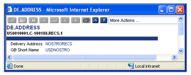 The DE.CARRIER contains names and address of bank’s customers and each company within the banking organisation. This table is used for entering all addresses like SWIFT address, TELEX address and special postal address. ID to be used for reconciliation is <COMPANYCODE>.<CUSTOMER NO>.<RECS.SLNO> (for example, US001001.C-100188.RECS.1) where RECS is ID in DE.CARRIER application.