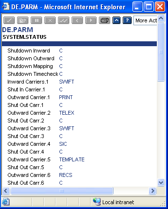 DE.PARM contains a single record that holds a number of parameters for controlling the processing of messages. The file contains the parameters that allow the operator to shut down the carrier control modules and the inward and outward formatting modules.