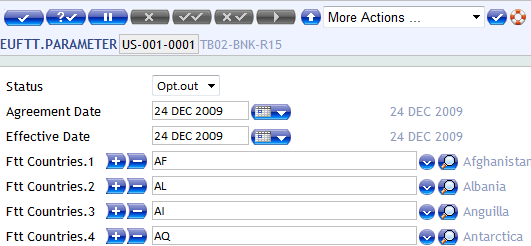 The EUFTT.PARAMETER is used to record the details of the institution’s agreement with the EFT, the effective date of the FI, status (opt-in or opt-out) and certain default conditions. It is necessary to state the countries opted for EU FTT regulation.