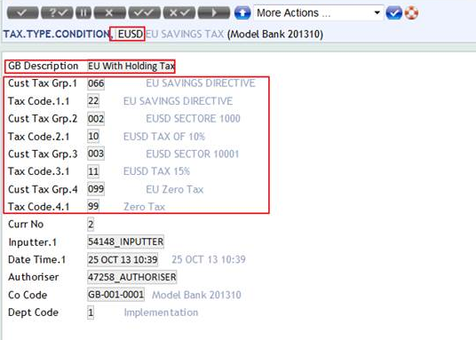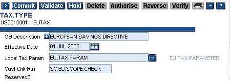The TAX.TYPE record for the EU Savings Directive is set-up as follows: