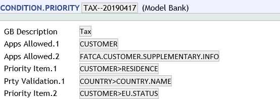 The CONDITION.PRIORITY application details the conditions to be considered to create customer groups. This application needs to be amended for tax if the bank requires addition of new conditions on which the grouping of customers are based on. If the existing grouping conditions are sufficient, then amendments are not required. A combination of the Residence field and EU.STATUS local reference can be used to define the customer groups and route tax postings to separate accounts per EU member state. Therefore, these two fields must be added to the CONDITION.PRIORITY with the appropriate record in TAX as shown below.