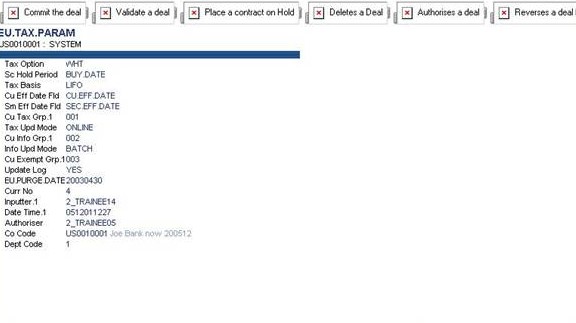 The EU.TAX.PARAM application is used for company level settings in relation to EU retention tax. If identical settings are to be used across a multi-company environment, the SYSTEM record can be used instead of inputting a record for every company.