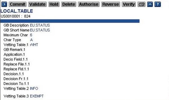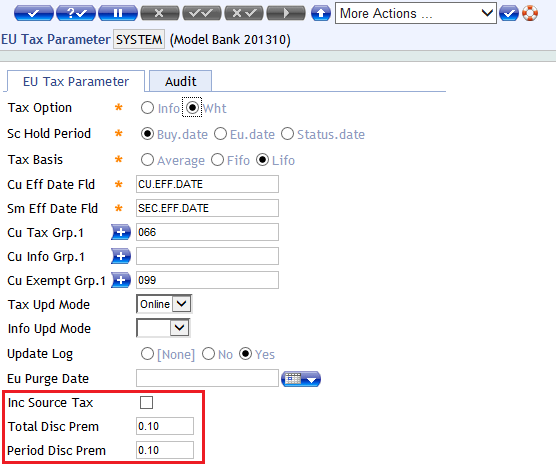 EU.TAX.PARAM. The name of this application cannot be changed and is hard-coded in the system. If any value other than EU.TAX.PARAM is set-up, EU tax is not calculated. - Cust Chk Rtn - Contains the routine which checks whether the customer is liable for this tax or not. The SC.EU.SCOPE.CHECK routine is provided as part of the ET module. This routine needs to be specified in this field.