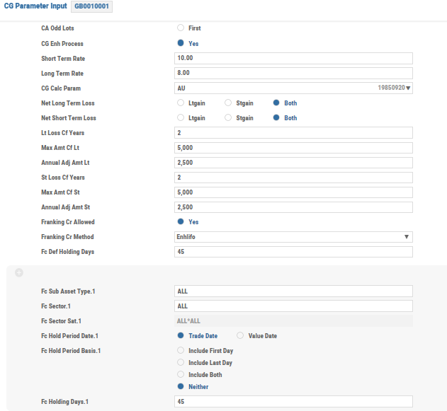 | Long Term Period | The tax lot held less than the period defined in this field is treated as a short-term holdings. NOTE: If left blank, then the value is defaulted from the CG.PARAMETER. |