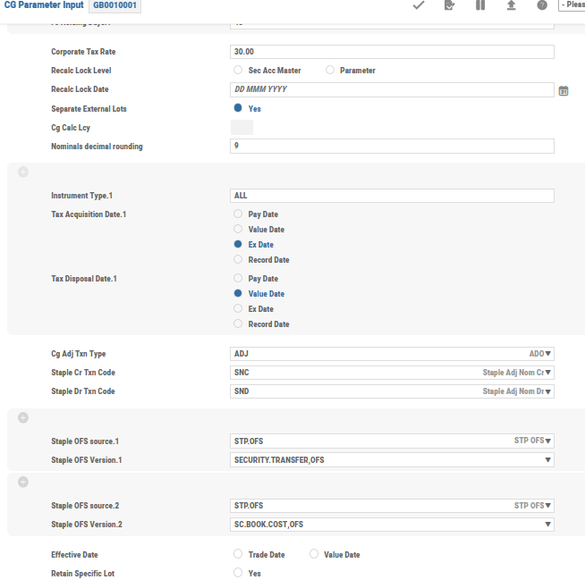 | Sep External Lots | This field is set to Yes to maintain separate tax records for external custody positions. If this field is left blank, then both the external and on-platform positions are updated in the same CG.TXN.BASE. |