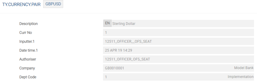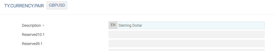TY.CURRENCY.PAIRand enter GBPUSD to create a new record. A new record is displayed. - Type the full name or short form of the currency pair name.