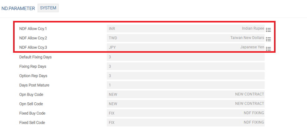 Currencies that are set as non-deliverable in Ndf Allow Ccy field in ND.PARAMETER can be set up as a non-deliverable or deal currency in TFO. Only these currency pairs are displayed in the Currency Pair field in the NDF Deal Capture screen in TFO.