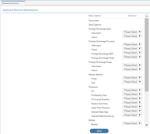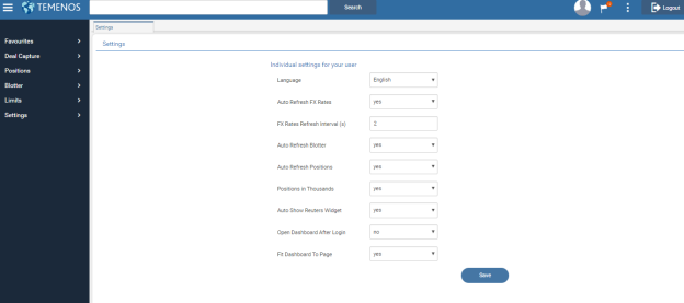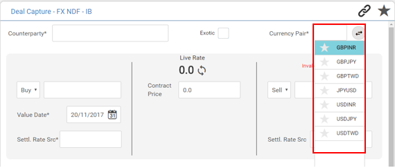The user can save any inquiry performed on the trade blotters, currency positions and others as a Favourite for repeated use. This helps to avoid entering search criteria when required.
