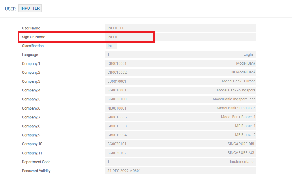 A valid username and password are required to log on to the application. The user application in Temenos Transact allows all the valid records with the required privileges to log on.