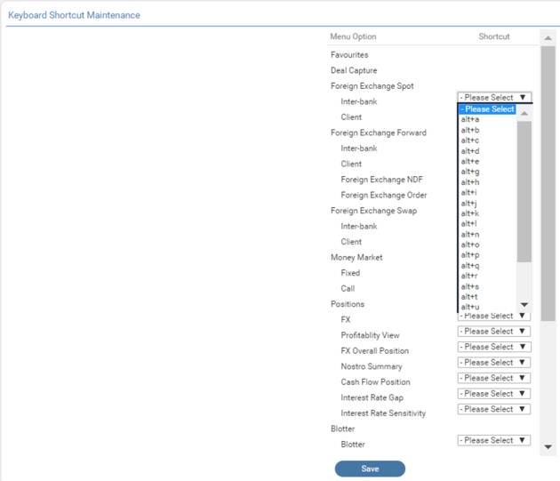 User can customise the keyboard shortcuts to access screens directly. The keyboard shortcuts settings can be set or controlled by navigating to Settings>Keyboard Shortcuts.