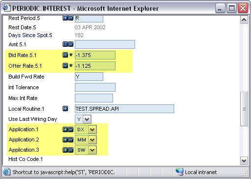 The PERIODIC.INTEREST application defines, for each currency, interest rates for any time period desired by the user for example, 10 days, 15 days, and 30 days. For each period defined by the user, both a bid and offer rate can be entered. Interest rates can also be defined by amount slabs, so a different rate can be entered for ranges from USD1 to 10,000 and between USD10,000 to 25,000.