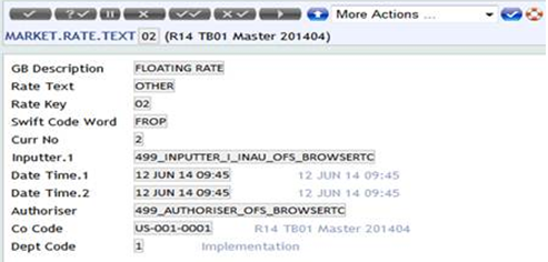 If the FLOATING RATE option is chosen as OTHER in the sequence C, the SWIFT standards expect the user to provide additional information in Tag 37N of MT360 and MT361 messages. Temenos Transact is enabled to auto default the additional information which includes a code word 'FROP' that is part of SWIFT.CODE.WORDS application.