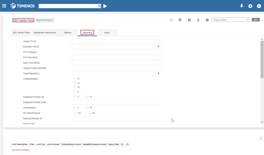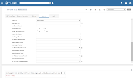 OTC application templates such as FX, ND, FRA, SWAP and DX are added with the reporting fields to support the common data fields. These reporting fields are grouped under one tab titled Reporting in Model Bank configuration.