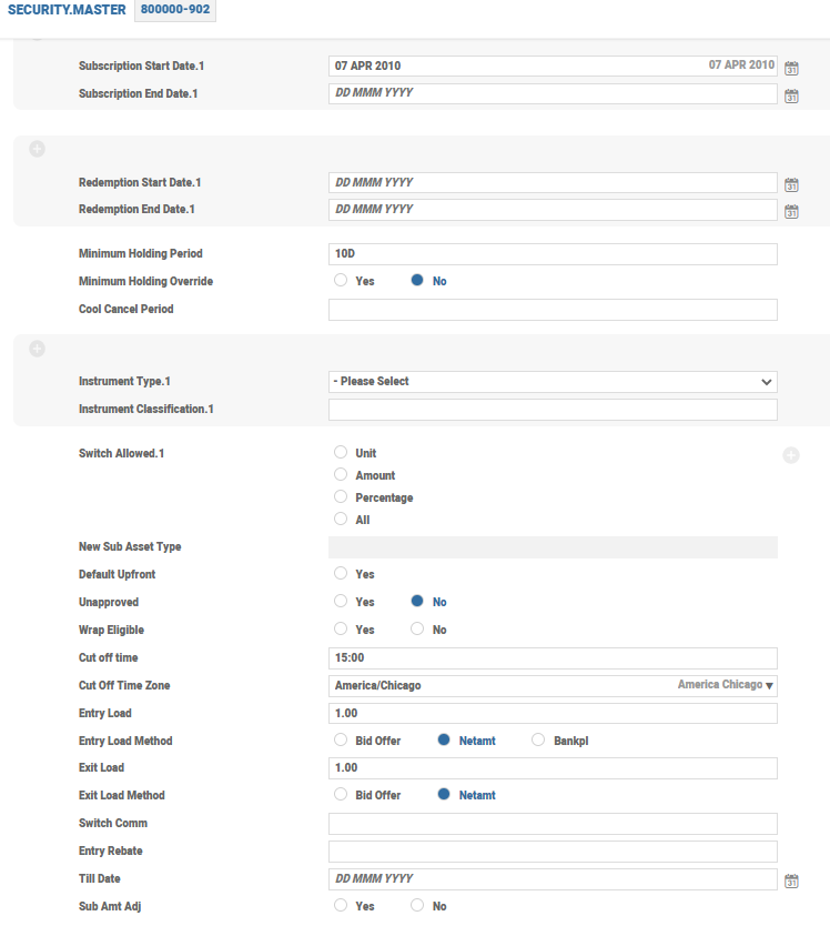 | Switch Allowed | Indicates whether the switch is allowed for the fund and what type of switch is allowed. It is a multi-value field that accepts the values UNIT, AMOUNT, PERCENTAGE and ALL. |