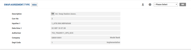 SWAP.AGREEMENT.TYPE file stores different types of agreements used in swap contracts, for example, ISDA, BBAIRS, and MASTER, and so on. Every contract is linked to an agreement type and the agreement type that is linked, is validated against the definition on SWAP.AGREEMENT.TYPE file and enriched with the associated description. Swift confirmation messages (that is, MT 360 and MT 361) require this information to be exchanged with the counterparty.