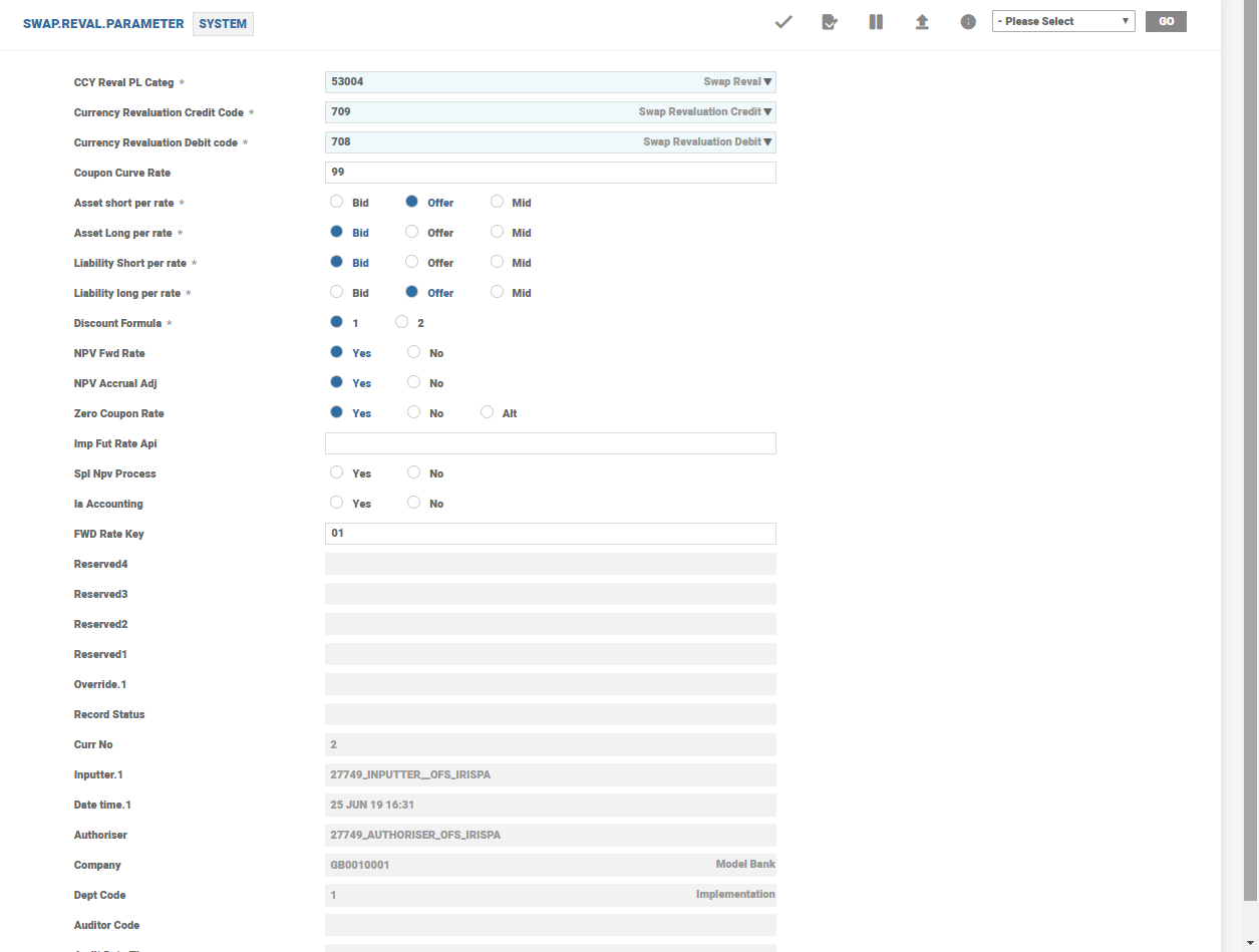 SWAP.REVAL.PARAMETERtable represents a coupon curve which is bootstrapped to build a zero coupon curve for discounting the cash flows of the swap to arrive at the net present value of the swap. The key also represents a zero coupon curve which can be used straight away to discount the cash flows. Whether the key represents a coupon or zero coupon rate curve is denoted by another field inSWAP.REVAL.PARAMETER, that is, Zero Coupon Rate.