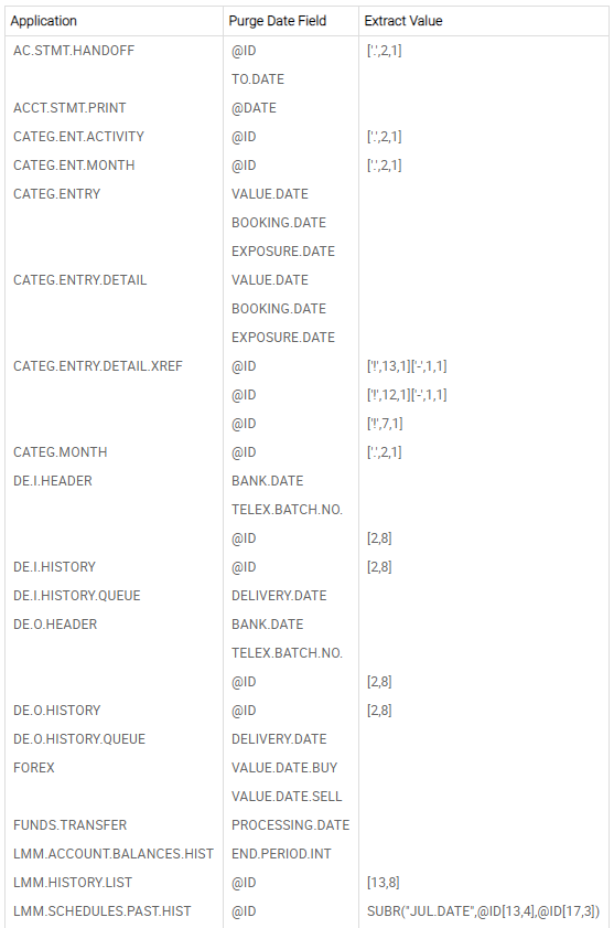 - CONTRACTARCHIVE.DATE (OUT Parameter 1) – Date against which the purge date set in the ARCHIVE record should be compared with. For example, in FUNDS.TRANSFER, you can compare debit value date and credit value date of the contract and return a final date as the OUT parameter, which is compared with the purge date finally for archival.