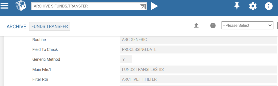This field must be set to Y to execute generic archival process. This allows the ARC.GENERIC archival service to do the selection and purging of records. For example, FUNDS.TRANSFER, TELLER, STMT.ENTRY.DETAIL and so on are archived using the generic archival process based on the inputs provided in the Main File, Field To Check or Filter Routine fields.