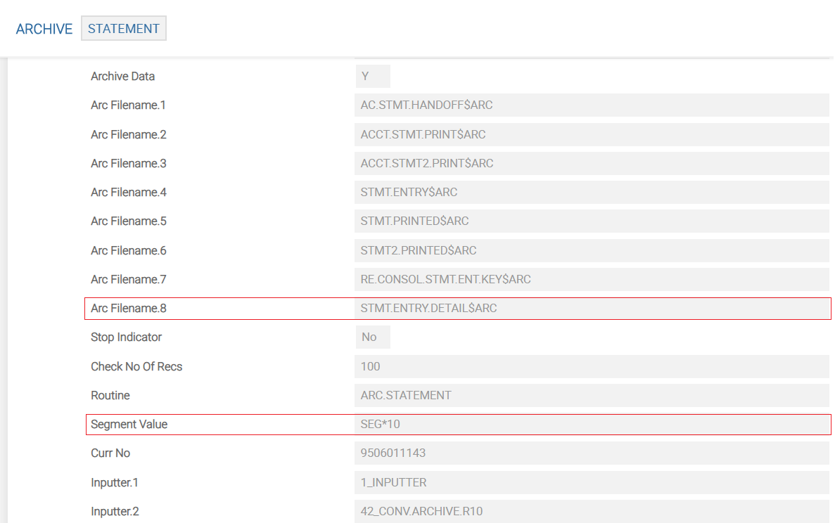 - ARCHIVE (STATEMENT) > ARC.FILENAME is set to STMT.ENTRY.DETAIL$ARC. This archives statement related tables just by running the STATEMENT archive alone instead of running it along with STMT.ENTRY.DETAIL.