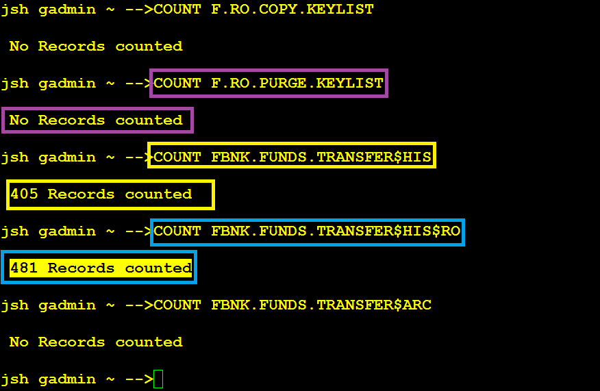 The following example screen captures show that the original record count of the FBNK.FUNDS.TRANSFER table has been reduced from 886 to 481 by moving 405 records to the RO database table FBNK.FUNDS.TRANSFER#HIS#RO, which were in the PURGE.DATE range into the.