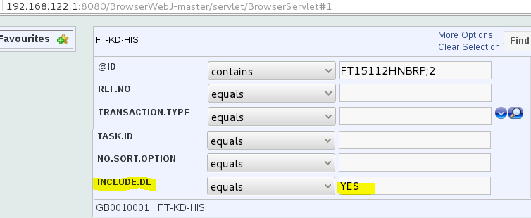 You need to select a RECID from FBNK_FUNDS_TRANSFER#HIS and FBNK_FUNDS_TRANSFER#HIS#RO from the LIVE and RO databases, respectively The following screen captures shows an example Funds Transfer record for the LIVE and RO databases, respectively.