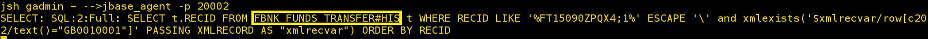 The following JQL select statement shows that the enquiry fetched records only from the FBNK.FUNDS.TRANSFER$HIS table in the LIVE database.