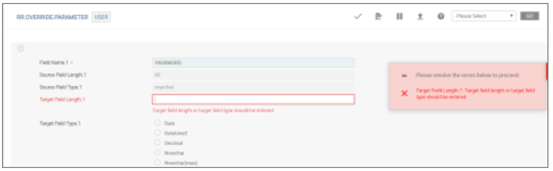 The error message Target field length or target field type should be entered is displayed because TARGET.FIELD.LENGTH and TARGET.FIELD.TYPE are empty.