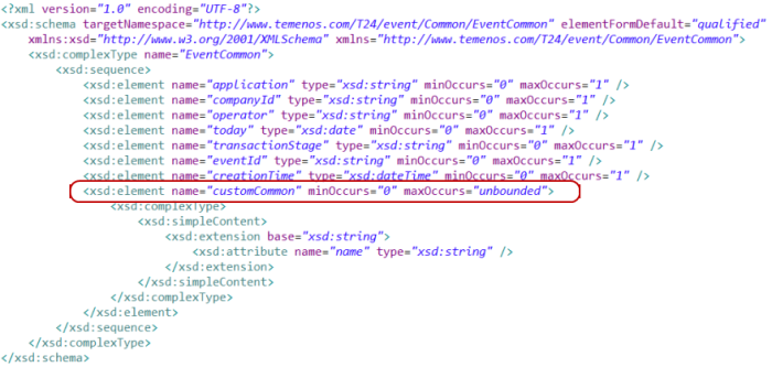 The EventCommon section holds a set of fixed elements and values except for the customCommon section. These values are not common to all implementations and may be defined on site (tag name and contents as well as the means to be used to retrieve the content values). These are to be considered common for all integration events that are saved for a particular implementation (system-wide).