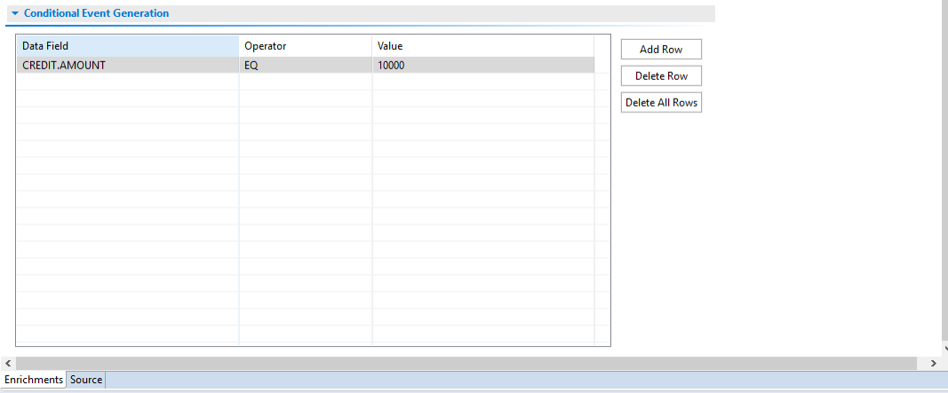 It contains three columns Data Field, Operator and Value. The Conditional Event Generation table has the following properties: