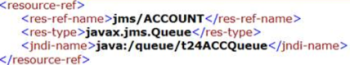 Here, the virtual queue name (provided in res-ref-name) used jms/ACCOUNT and is based on the example Integration Service Param configuration. It could be jms/CUSTOMER, jms/SECTOT etc. In general, the virtual queue name should follow the format below: