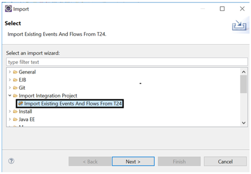 Under Import Integration Project select Import Existing Events And Flows From T24.