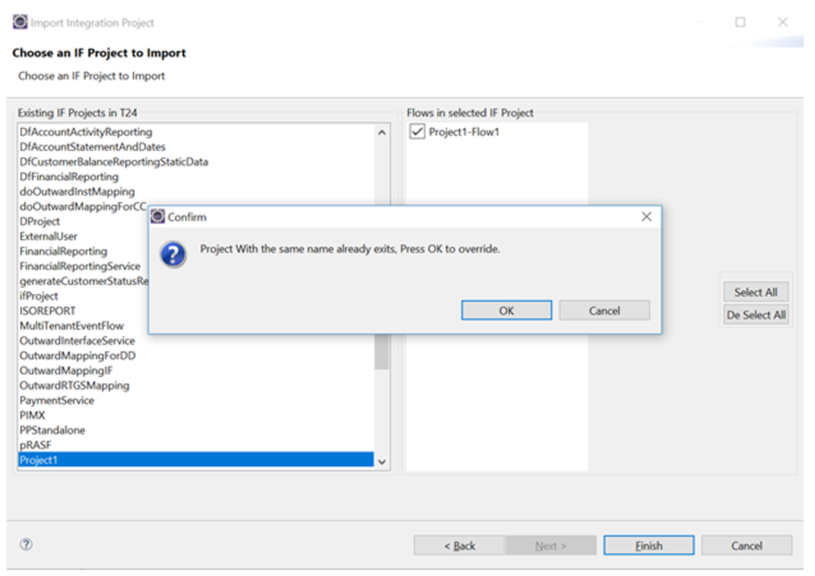 While importing, if a project with the same name already exists in the workspace, a confirmation message is displayed. To override the existing project click OK. Otherwise click Cancel.