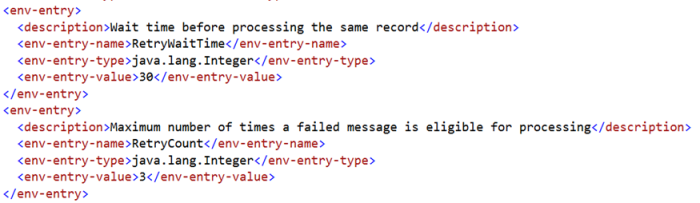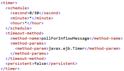 This InflowFailureRecoveryEjbTimer bean has a timer configuration to poll for failed messages. By default, InflowFailureRecoveryEjbTimer retries a message once in 30 seconds: