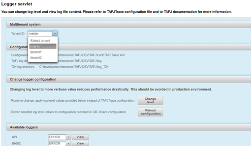 In the above configuration, Logger servlet for t2user is assigned Tenant2User and TAFJUser. This specifies that t2user can access tenant2 logs only and as a TAFJUser it cannot change any log level configuration.