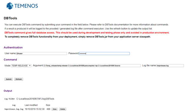 DBtools -cf tafj.properties -log tmprelease.log TEMP-RELEASE C:\Temp_release\temp.release C:\LocalArea\201806\precompiled -bp C:\LocalArea\201806\Source