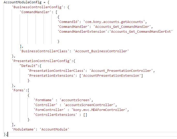 • The command handler extension class is mentioned in the module config as shown above. In the above example, the AccountModule_GetAll_Handler, this class implementation is as follows: