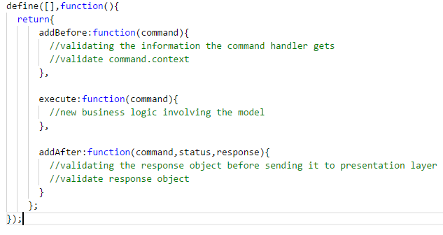• This is the base command handler and it will have the business logic inside the execute method. With the help of the command handler extension, you can either override the whole business logic, or you can add some logic before the execute method like a pre processor method, and you can add some logic after the execute method like post processor. This pre processor method called addBefore, can involve a gateway check logical implementation of the context that enters into the command handler, and the post processor method, addAfter can involve the data processing or checking after making the execute call.