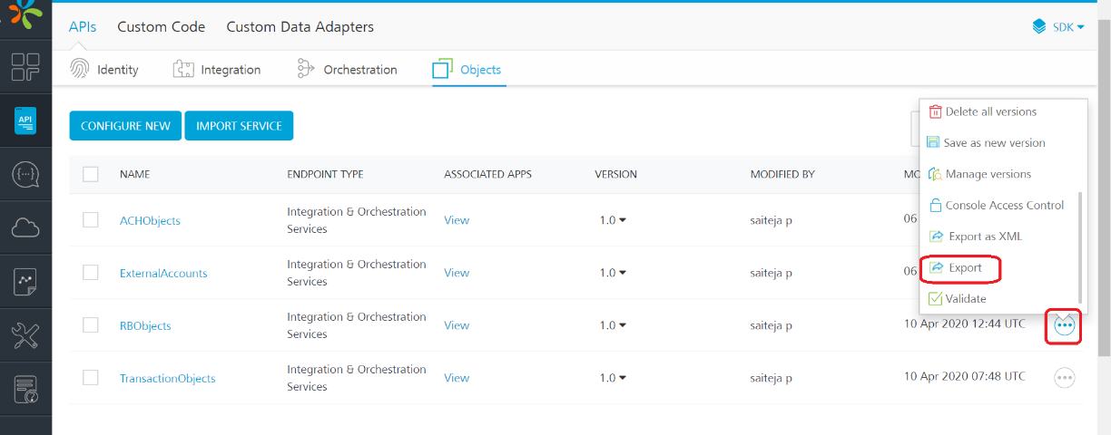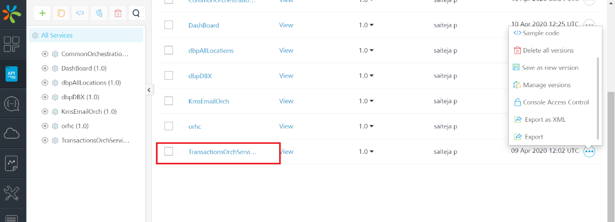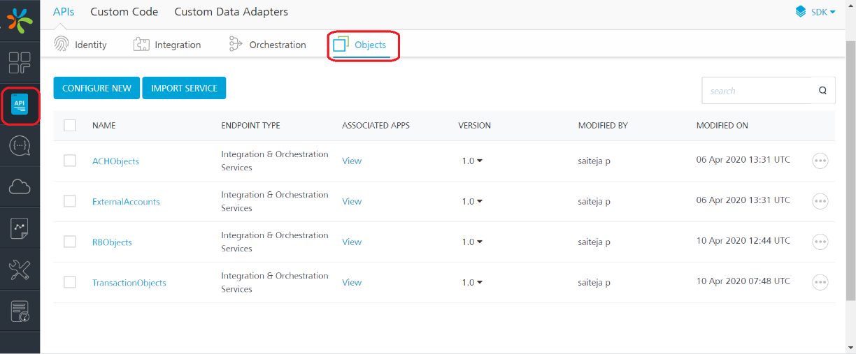 When you import the Holdings Fabric App to the Quantum Fabric Console, the TransactionsOrchService also gets imported to the console. Go to API Management > APIs > Object to verify if the TransactionsOrchService is present in your environment.