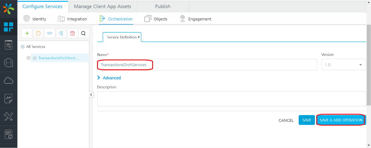 - Name the service TransactionsOrchServices. The Java code will invoke this service