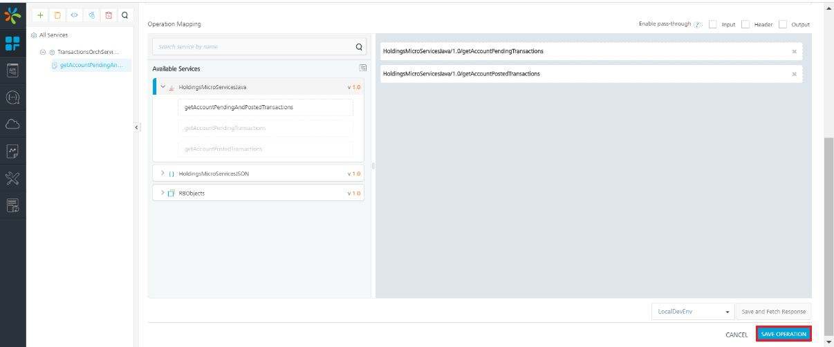 - Under Operation Mapping > Available services, search and add the getAccountPendingTransactions and getAccountPostedTransactions services to the Orchestration service.