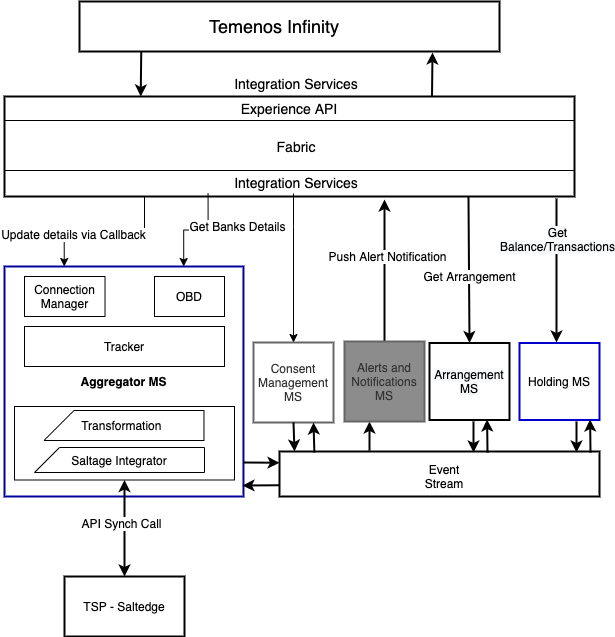 Communicates with the TPP provider and transfers the respective account and transaction details to the Arrangement and Holdings microservices. |