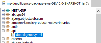 The OAS Swagger json document is available in the /ms-duediligence-package-aws-<release no>.jar/api/duediligence.yaml path.