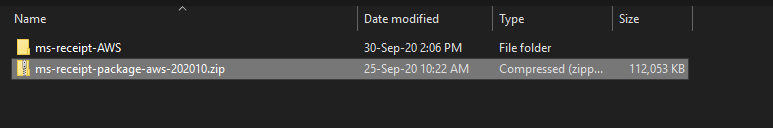 The Receipt Microservice for AWS deployment is available as a single release bundle. For example ms-receipt-package-aws-<RELEASE_NUMBER>.zip.