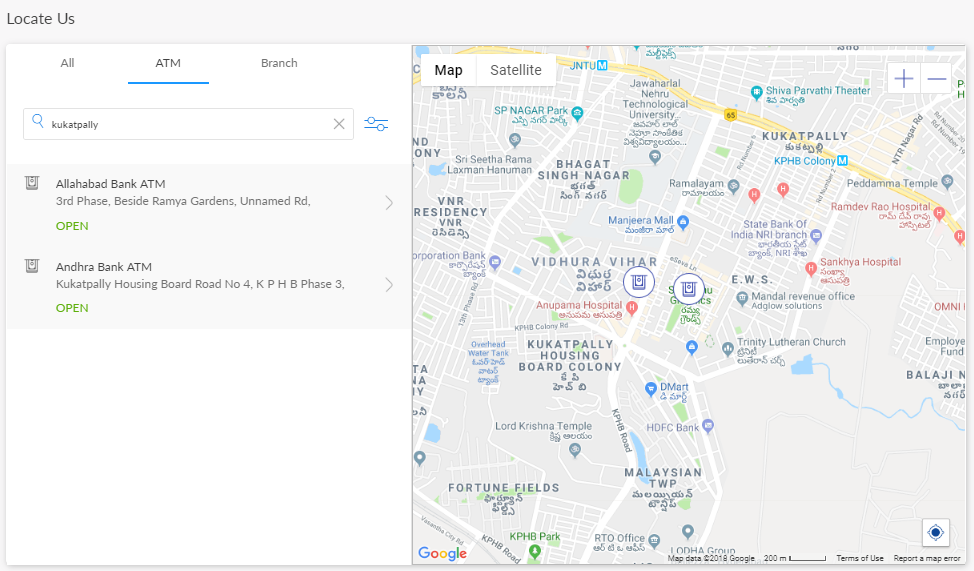 By default, the app displays the nearest ATM/branch of your bank on the Maps screen in both list-view and map-view formats. When you use this feature for the first time, the app requests your permission to access your current location. If you click Block, the app displays a message that the browser does not support Geo-location and does not display the maps screen. Click Allow. The app displays the ATMs and branches near your current location on the maps screen. The app indicates your current location by using a different-colored pin. If no results are found, the app displays an appropriate alert message. You can also switch between maps-view and satellite-view.