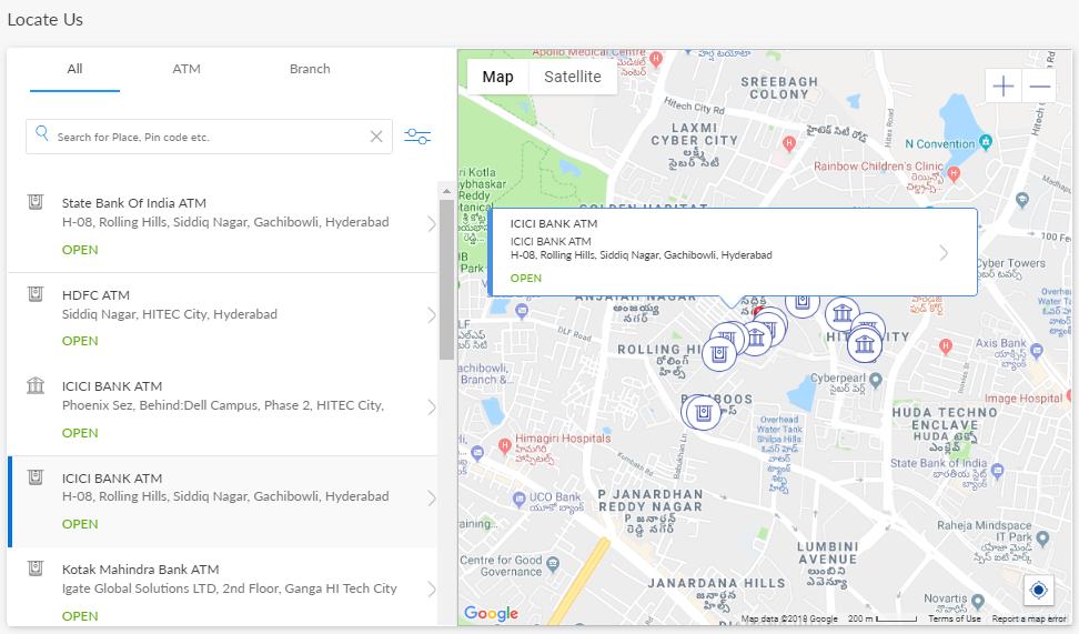 The pin image for ATMs is different from that of branches. When you click each pin, the app displays the following attributes: Name, Address, and Status (whether open or closed at that point of time). The app also displays the current status of the branch/ATM (whether open or closed at that point of time) on the list screen.