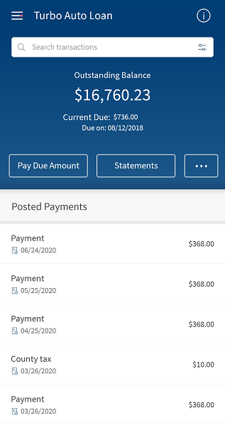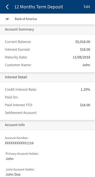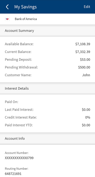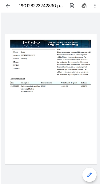 to view and edit the account details. - Tap Statements to view the monthly account statements. The account statements are available for all account types (checking, savings, investment, credit card, and loan) except external accounts and does not have any restrictions in the product, but if a bank does not want to offer statements for a specific account type, the bank can do so by hiding the Statements button for that specific account type.