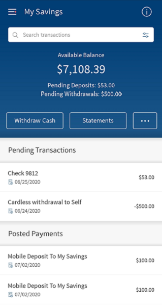 - Click any of the tabs (Transfer, Deposits, Checks, and Withdrawals) to view the corresponding transactions under Pending or Recent.