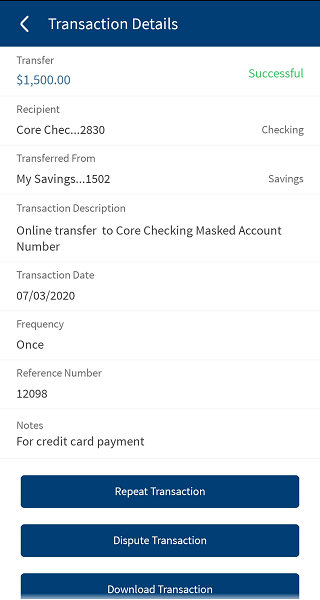 View the details, such as the transaction amount, the payee account, the account number, the account from which the amount was transacted, the transaction ID, the transaction scheduled for date, whether the transaction is a recurrence or one-time, and any provided notes.