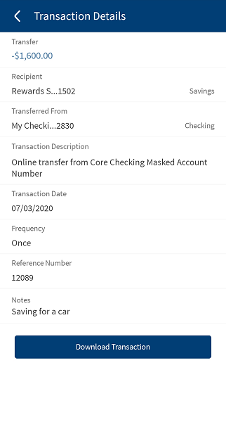 View the details, such as the transaction amount, the payee account, transaction description, the account from which the amount was transacted, the transaction ID, frequency, notes, and the transaction date.